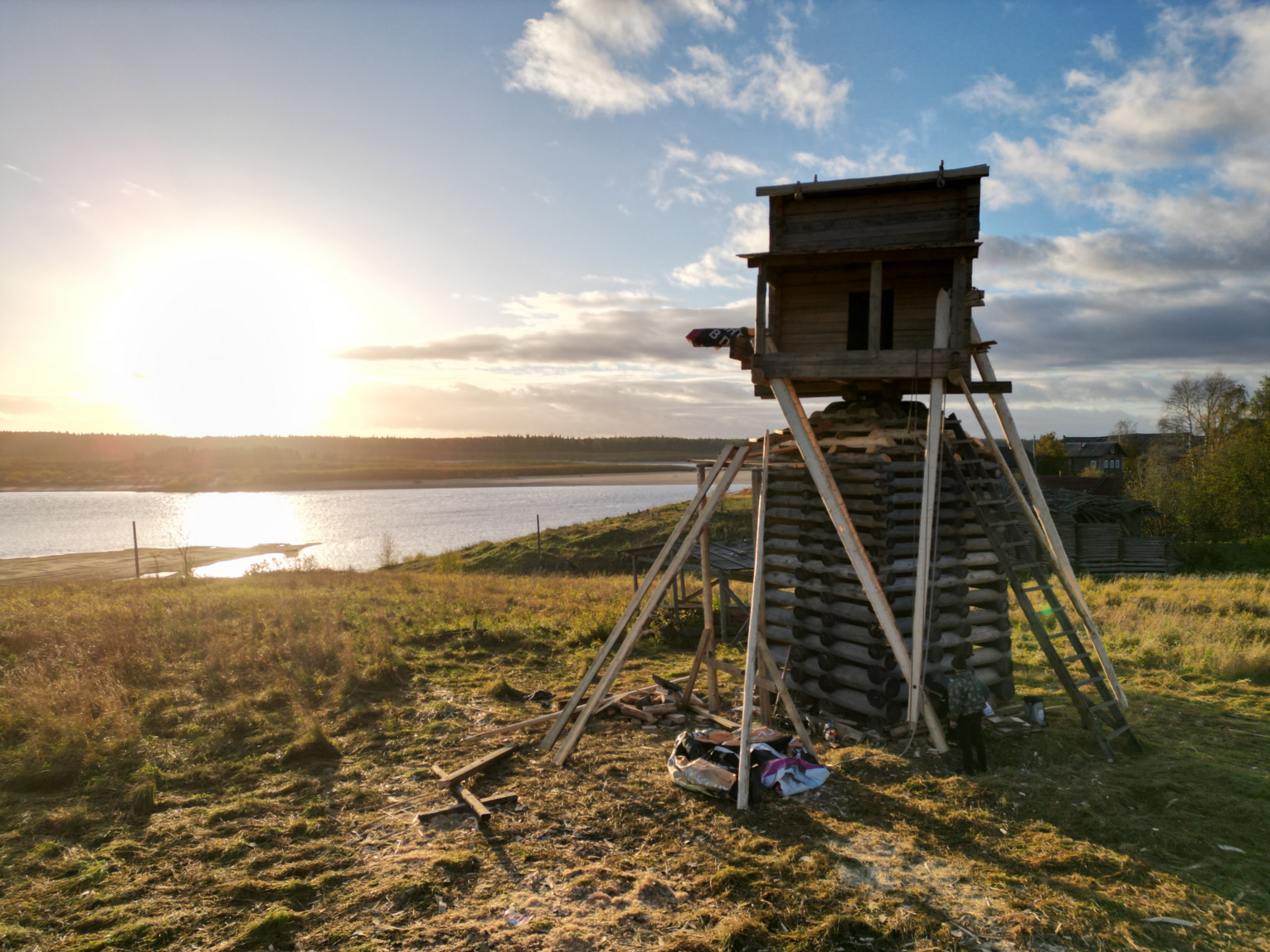 13 октября 2023г. Проект "Северные Мельницы" получил продолжение. Сруб амбара старинной мельницы из деревни Погорелец, Мезенского района, Архангельской области, вывезенный на реставрацию в 2019 году собран.
